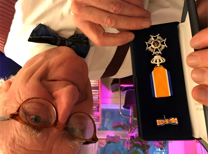 Op zijn eigen kenmerkende, ludieke wijze zette hij deze foto op zijn website met onderschrift dat hij “volledig ondersteboven was van deze hem toegekende onderscheiding”