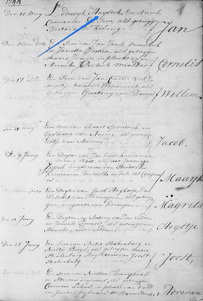 Jan Lodewijksz Haystek. Hij is gedoopt op zondag 10 mei 1744 in Almkerk en Emmikhoven.