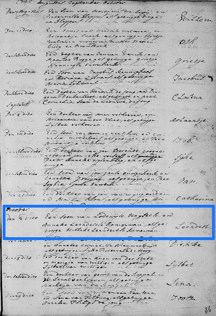 Lodewijk was een paar maanden eerder 19 jaar geworden toen hij op vrijdag 30 december 1729 in ondertrouw ging met de vier jaar minder jonge Anneke Leendertse Camerman. Hun huwelijk werd op 14 januari 1730 gesloten. Negen maanden later werd hun eerste kind geboren. Over het testament van Lodewijk en Anneke is eerder op dit weblog gepubliceerd. Klik hier om het artikel te lezen.