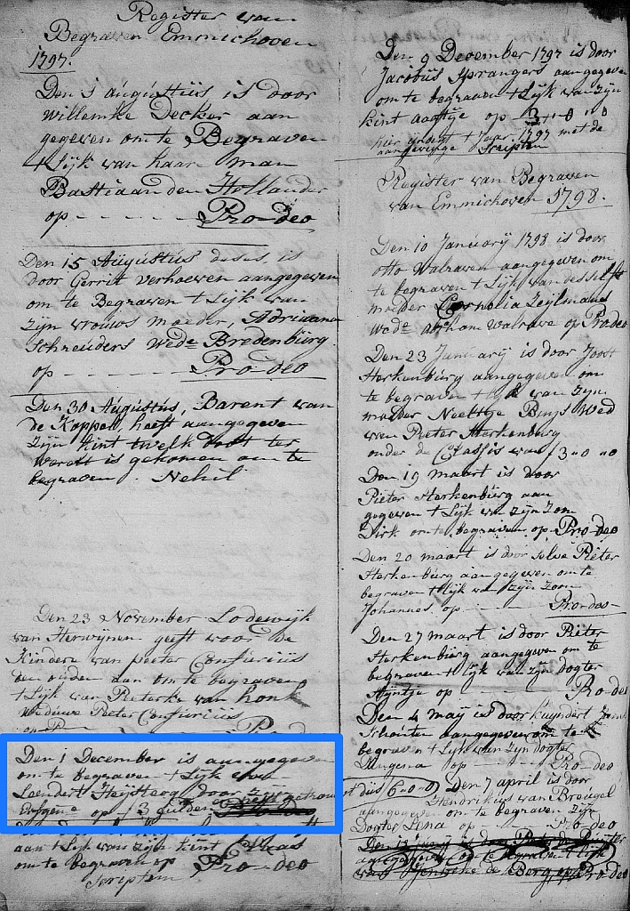 In het begrafenisboek van Emmikhuizen is te lezen dat: “”Op 1 December is aangegeven om te begraven t lijk van Leendert Heijsteeg”. [geslachtsnaam onjuist geschreven; red.]