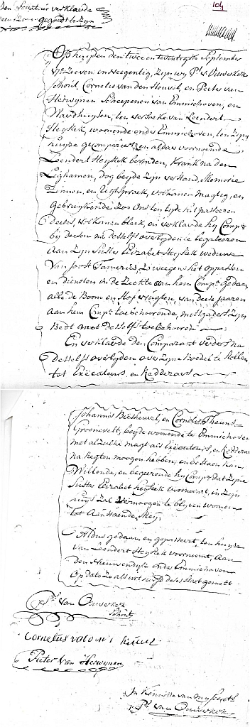 Op Huijden den twee en twintgste september 17 zeeven en neegentig, zijn wij P van Ouwerkerk Schout, Cornelis van den Heuvel, en Peeters van Herwijnen Scheepenen van Emmickhoven, en Waerdhuijsen , ten versoeke van Leedert Heijstek, woonende onder Emmickhoven, ten zijne huijze gecompareert, en aldaer voornoemde Leendert Heijstek bevonden, Krank na den Lighamen, dog beijde zijn verstand, Memorie Zinnen, en Uijtspraek, volkomen magtig, en gebruijkende, zoo ons ten tijde het passeeren deeses, volkomen bleek, en verklaerde hij Compareeren bij deesen na desselfs overlijden te legateeren Aan zijn Suster Elizabet Heijstek weduwe van Joost Tameris, zo weegens het opassen en diensten in de Ziekte aan hem Compareeren gedaan alle de Boom en Hofvrugten van deese jaaren Aan hem Compareeren, toebehoorende, mitsgaders Zijn Bedt met desselfs toebehooren En verklaerde den Coparant verders na desselfs overlijden over Zijne Boedel te stellen tot Exëcuteurs en Redderaers Johannis Biesheuvel en Cornelis Theuns Groenevelt, beijde woonende te Emmikhoven met zulke magt als Excüteurs en Redderaers na Regten moogen hebben, en bestaen Kan,Willende en begeerende hij Compareren, dat zijn Suster Elizabet Heijstek voornoemt, in Zijn Huijs Zal Vermoogen te blijven woonen tot Aanstaende Meij.