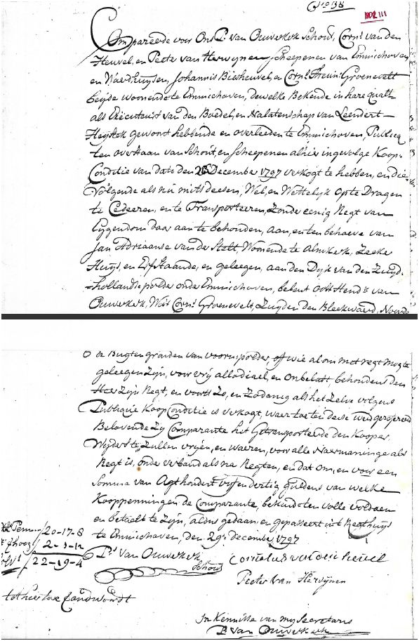 Compareerde voor ons P van den Ouwerkerk Schout, Cornelus van den Heuvel, en Peeter van Herwijnen Scheepenen van Emmickhoven en Waerdhuijzen, Johannis Biesheuvel, en Cornelis Theun Groenevelt beijde woonende te Emmickhoven, de welke Bekende in hare qualiteit als Exécuteurs van den Boedel en Nalatenschap van Leendert Heijstek gewoont hebbende en overleeden te Emmickhoven Publieq ten overstaan van Schout, en Scheepenen alhier ingevolge Koop Conditie van dato den 23 December 1797 verkogt te hebben, en dievolgende als nu mits deesen, Wel en Wettelijk Op te Dragen te Cedeeren en te transporteeren, Zonder eenig Regt van Eigendom daar aan te behouden,aan, en ten behoeve van Jan Adriaan van der Stelt, Woonende te Almkerk, Zeeker Huijs, en Erfstaande en geleege, aan den Dijk van den Zuijd hollandse polder onder Emmickhoven, bekent Oostend van Ouwerkerk, West Corn. Groenvelt, Zuijden den Bleekwaerd, Noorden de Buijten gronden van voorn. Polder,of wie alom met regt mog te geleegen Zijn, voor vrij alladiael, en onbelast, behoudens den Heer Zijn Regt en voortt Zo, en Zodanig als het zelve volgens Publique Koop Conditie is verkogt, waer toe ter dese weid geofereerd Belovende Zij Comparante het Getransporteerde den Kooper Weijders te zullen Vrijen, en waeren, voor alle naernaninge als Regt is, onde verband als na Regten, en dat om, en voor een Somma van Agthondert vijf en dertig gulden van welke Kooppenningen de Comparante, bekende ten volle voldaen en betaelt te zijn, aldus gedaan en gepasseert in’t Regthuijs te Emmickhoven, den 29 december 1797
