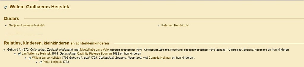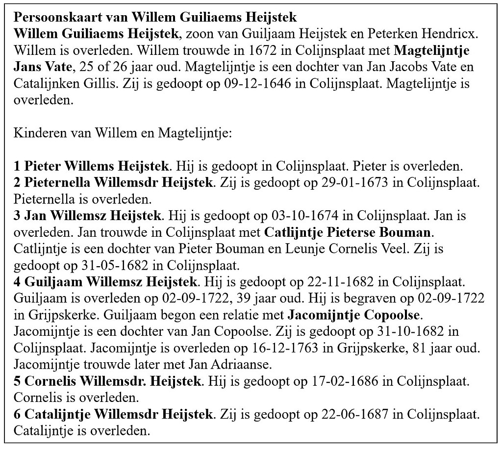 Willem Guiljaemsz Heijstek was de oudste zoon van Guiljaam. In het Zeeuwse archief is een notitie teruggevonden dat een Willem Guilliaems Heijstek ouderling was in Middelburg. Dit zal ongetwijfeld “onze” Willem zijn. In Zeeland maakte hij kennis met Magtelijntje Jans Vate die op de 9e december 1646 in Colijnsplaat was gedoopt. In het jaar 1672 zouden zij met elkaar zijn getrouwd. In dit gezin werden zes kinderen geboren.